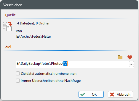 Diese Option wirkt sich aus wenn im Zielordner bereits eine Datei mit gleichem Namen, wie die zu verschiebende Datei, existiert. In so einem Fall wird die Zieldatei automatisch ohne Nachfrage umbenannt.