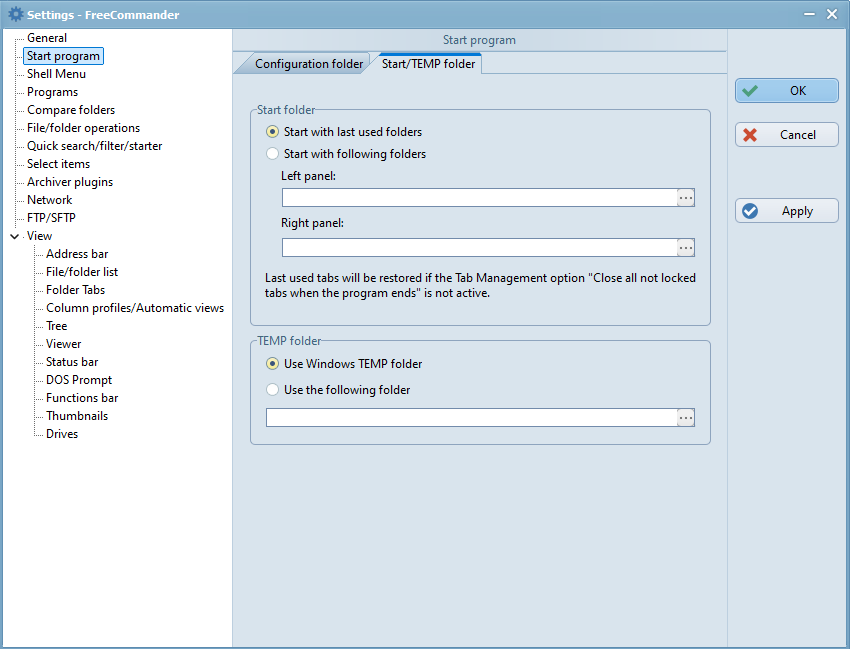 Under this setting the user may define which folders will be opened in the right and left panels when FreeCommander is started.