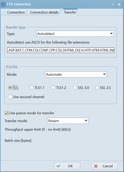 All other settings in the tab "Transfer" should only be used by users with a profound knowledge in FTP.