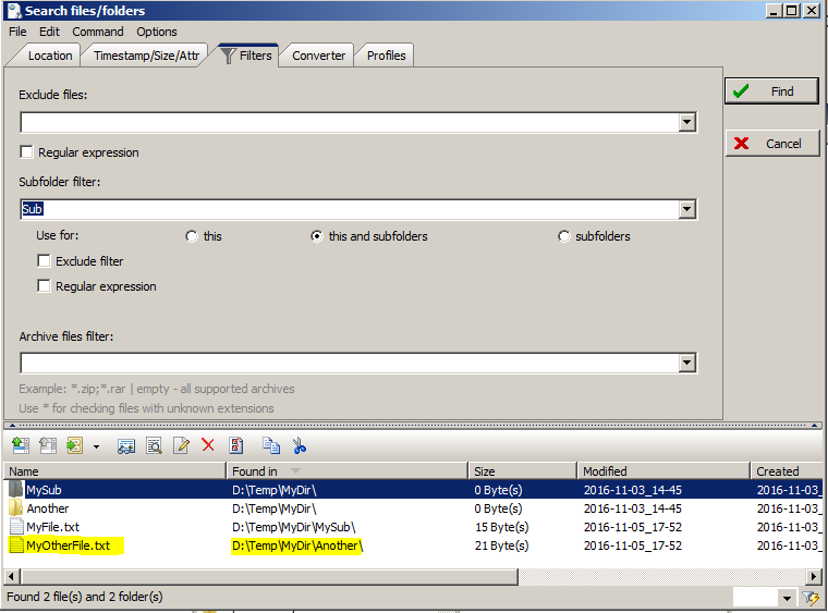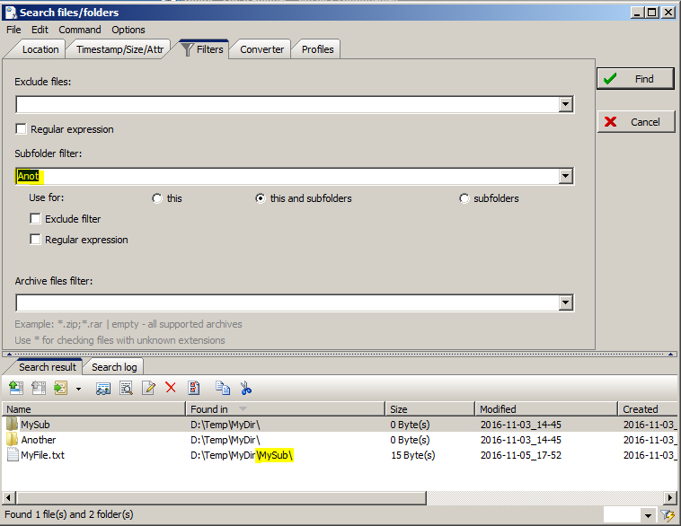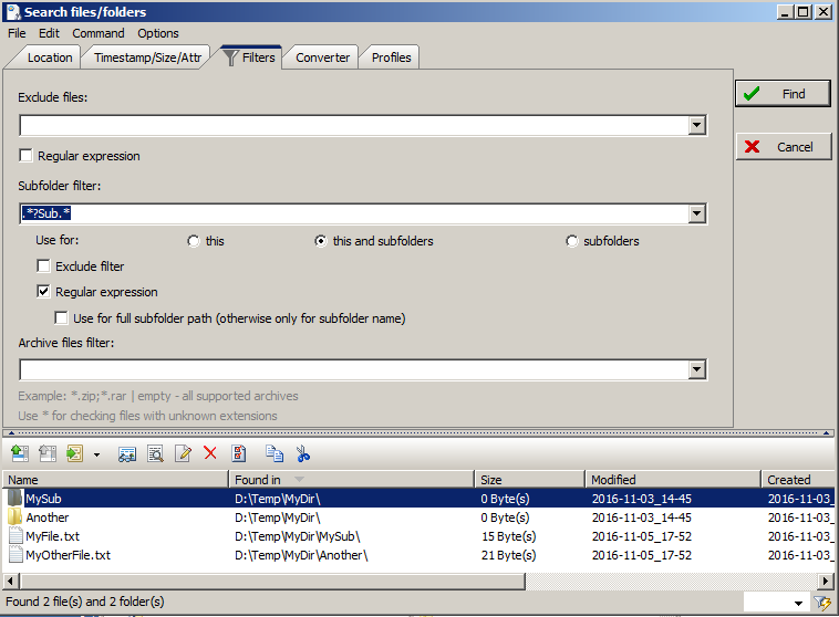 I would like to filter on path with substring "Sub" to find "MyFile.txt" or "Anot" to find "MyOtherFile.txt"