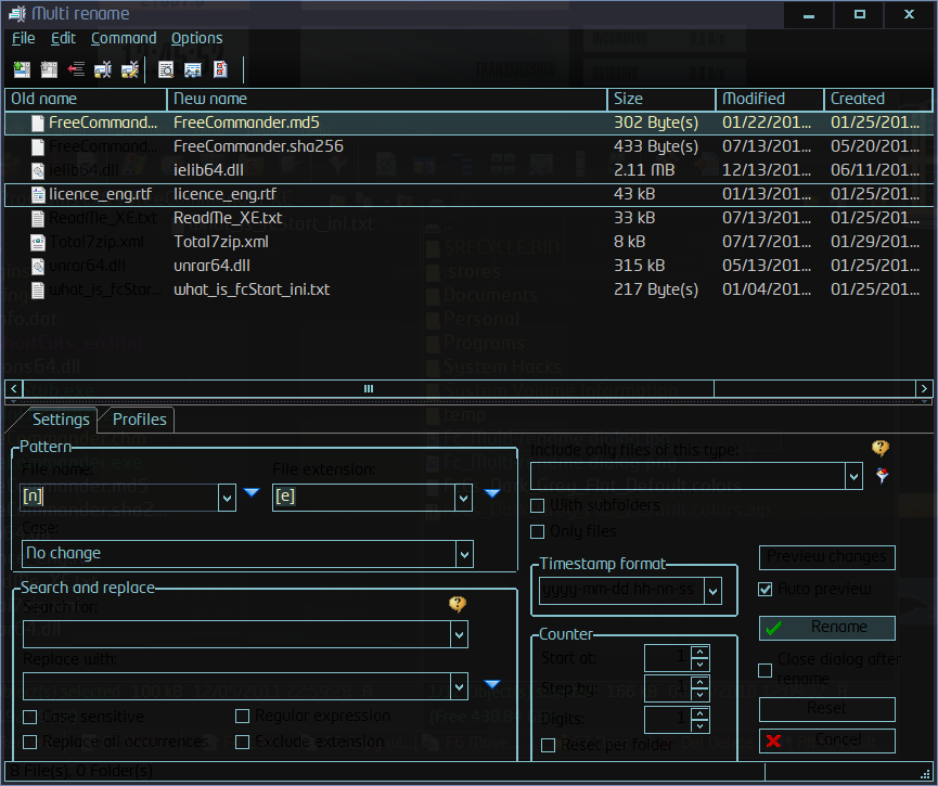 It's been a ling time since my last post. I really haven't had any issues with FreeCommander, until recently. I am running Windows 10. I recently changed theme to Windows 10 high contrast black theme. I managed to change the modifiable colors to something less "contrasty". All system apps now have a dark theme. I have been using a dark theme for FC for some time now. It has always looked fine until now. The problem is with the dialogs in FC. Most of them now show some black text on black background. This includes editable boxes. as well as labels. I have searched through the settings many times, but found no solution. If I use no theme for FC, the dialogs are still shown incorrectly. They appear to be not fully themed according to the system theme. I have attached a snapshot of the multi-rename dialog. You can see that labels for checkboxes are black on black, as well as text in drop-down boxes. I have the same problem if I choose to use a dialog for renaming instead of the slow double-click. The file to be renamed is black on black unless I highlight it.