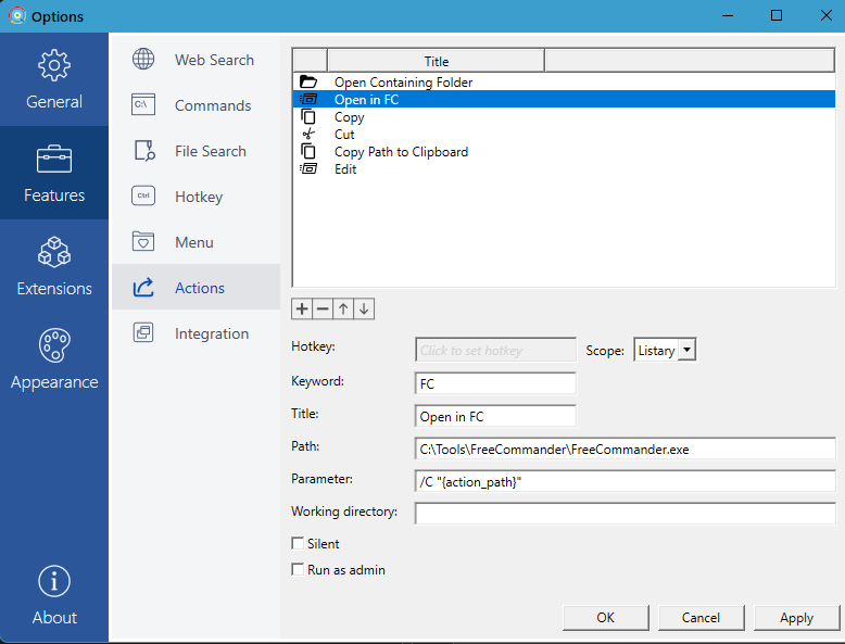 yes, my listary has checked. It works with OLD FC well, but with the new fxce, it doesn't work at all.BGM wrote:In your Listary settings, go to "By Window Type" toward the bottom, and in the checkbox list, make sure FreeCommander XE is checked.